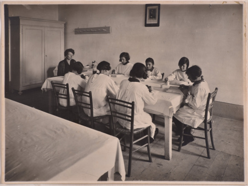 Vista in diagonale dellaula di smacchiatura della Regia Scuola Industriale femminile di secondo grado "Pietro Scalcerle" di Padova, durante una lezione. Sedute attorno a uno dei due tavoli ivi collocati, le alunne si esercitano sotto lo sguardo dellinsegnante, a capotavola. Nell'ambiente, umilmente arredato, si nota alla parete il ritratto di Benito Mussolini.