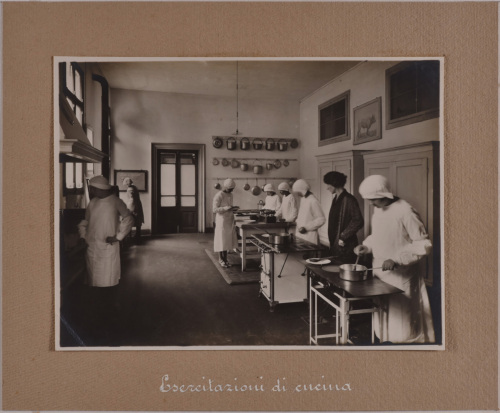 Vista leggermente decentrata, in direzione della porta d'ingresso, del laboratorio di cucina nella Regia Scuola Industriale femminile di secondo grado "Pietro Scalcerle" di Padova, durante una lezione. Si nota la presenza di una cucina a legna e di una più moderna cucina a gas. Le alunne, ognuna impegnata in uno specifico lavoro, indossano grembiuli da massaia, mezzemaniche e cuffie, a indicare la cura con cui le norme igieniche venivano praticate.