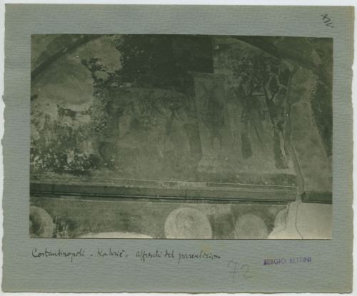 Riproduzione fotografica dell'affresco presente nel paracclesion, la tipica cappella laterale dell'architettura bizantina. L'affresco risulta estremamente deteriorato tanto da impedirne la lettura iconografica.