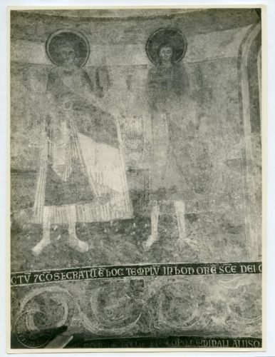 Riproduzione fotografica di un particolare degli affreschi (dopo il restauro) presenti nell'abside della Basilica di Santa Maria Assunta ad Aquileia, città del Friuli Venezia Giulia. Il particolare riprodotto rappresenta alcuni dei martiri aquileiesi.