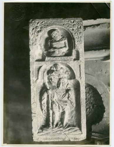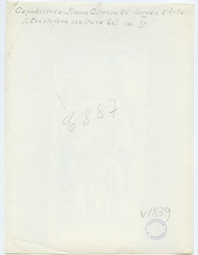 Riproduzione fotografica di una scultura del sec. XV conservata, nel momento della ripresa, presso il Museo civico di storia e d'arte di Koper (Capodistria), città della Slovenia. La scultura rappresenta San Cristoforo e Cristo.
