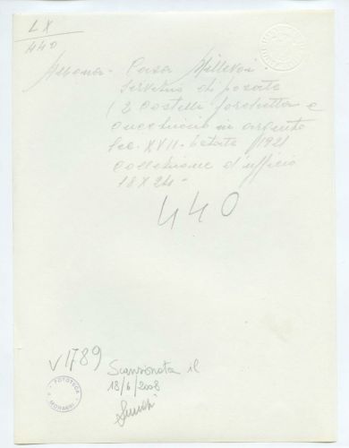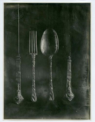 Riproduzione fotografica di un servizio di posate d'argento del secolo XVII(composto da due coltelli, una forchetta ed un cucchiaio), di proprietà della famiglia Millevoi e conservato, al momento della ripresa, presso la loro casa di Labin (Albona), città croata dell'Istria.