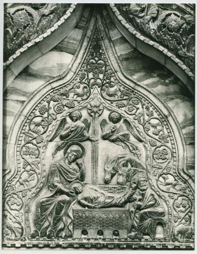Riproduzione fotografica del bassorilievo al centro del portale dei Fiori nella facciata settentrionale della Basilica di San Marco a Venezia. Nel bassorilievo è rappresentata la Natività.
