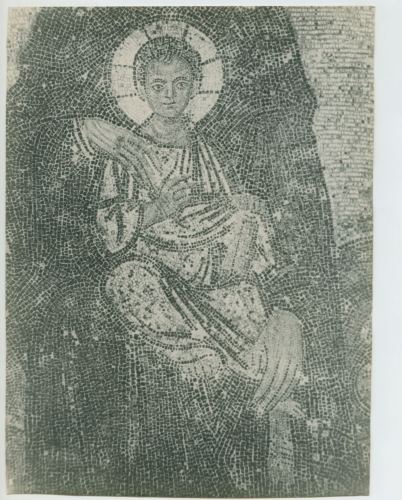 Riproduzione fotografica del mosaico che rappresenta il bambino Gesù, collocato nella lunetta del vestibolo della basilica di Santa Sofia a Istanbul.