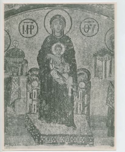 Riproduzione fotografica del mosaico che rappresenta la Madonna con in grembo Gesù, collocato nella lunetta del vestibolo della basilica di Santa Sofia a Istanbul.