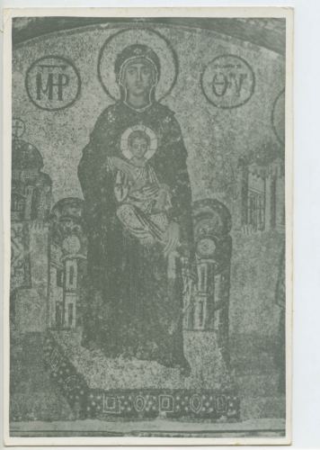 Riproduzione fotografica del mosaico che rappresenta la Madonna con in grembo Gesù, collocato nella lunetta del vestibolo della basilica di Santa Sofia a Istanbul.