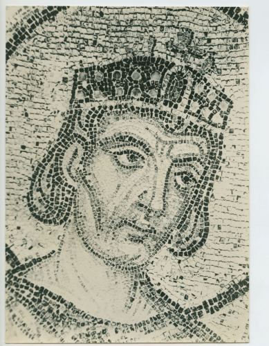 Riproduzione fotografica del mosaico che rappresenta il volto di Giustiniano, collocato nella lunetta del vestibolo della basilica di Santa Sofia a Istanbul.