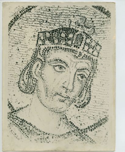 Riproduzione fotografica del mosaico che rappresenta il volto di Giustiniano, collocato nella lunetta del vestibolo della basilica di Santa Sofia a Istanbul.