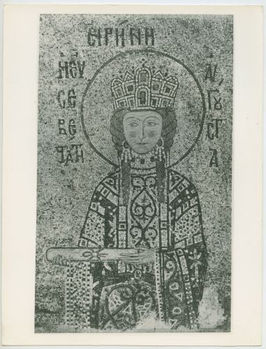 Riproduzione fotografica di una porzione di mosaico che riproduce Irene, moglie di Giovanni Comneno, collocato nel matroneo sud della basilica di Santa Sofia a Istanbul.