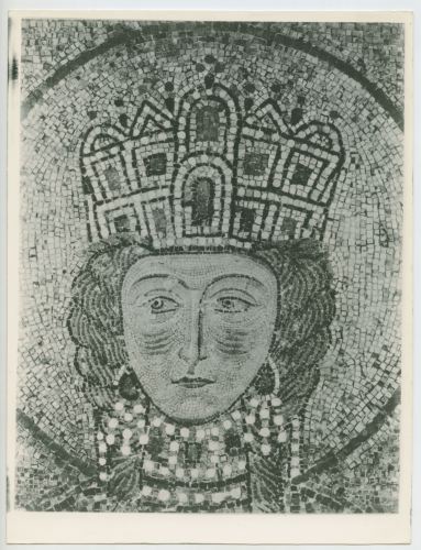 Riproduzione fotografica di una porzione di mosaico che riproduce il volto di Irene, moglie di Giovanni Comneno, collocato nel matroneo sud della basilica di Santa Sofia a Istanbul.