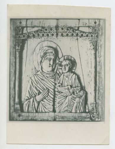 Riproduzione fotografica di un bassorilievo ligneo che rappresenta la madonna con bambino conservato presso la Biblioteca dell'Università di Erlangen.