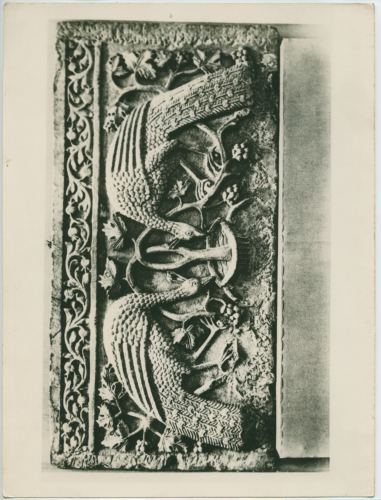 Riproduzione fotografica di un pannello marmoreo decorato con pavoni conservato presso l'Atles Museum di Berlino.