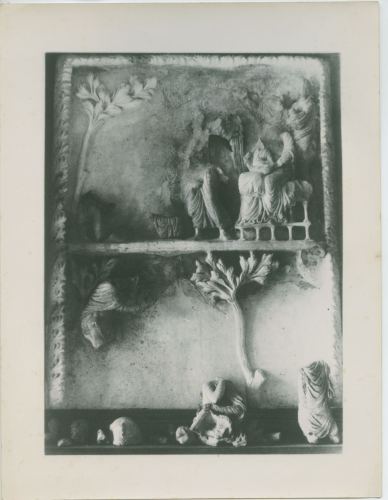 Riproduzione fotografica di un bassorilievo marmoreo decorato conservato presso il Museo nazionale di Cartagine.