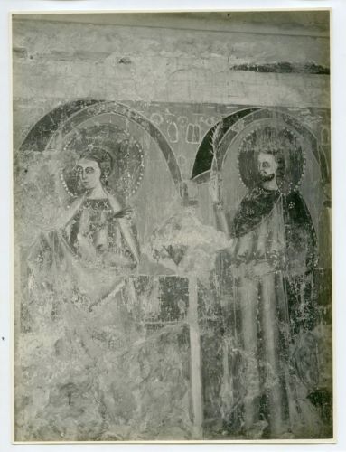 Riproduzione fotografica di un particolare degli affreschi (dopo il restauro) presenti nella navata trasversale sinistra della Basilica di Santa Maria Assunta ad Aquileia, città del Friuli Venezia Giulia. Il particolare riprodotto rappresenta due santi.