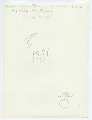 Riproduzione fotografica di una parete con stucchi del sec. XVIII all'interno del Palazzo dei Conti Tarsia, presso Koper (Capodistria), città della Slovenia. Al momento della ripresa il palazzo era la sede della Casa del Popolo di Koper.