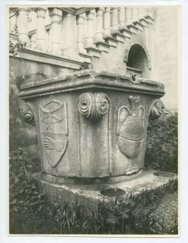 Riproduzione fotografica di una vera da pozzo, decorata con stemmi araldici, situata, al momento della ripresa, presso il cortile del Palazzo vescovile di Koper (Capodistria), città della Slovenia.
