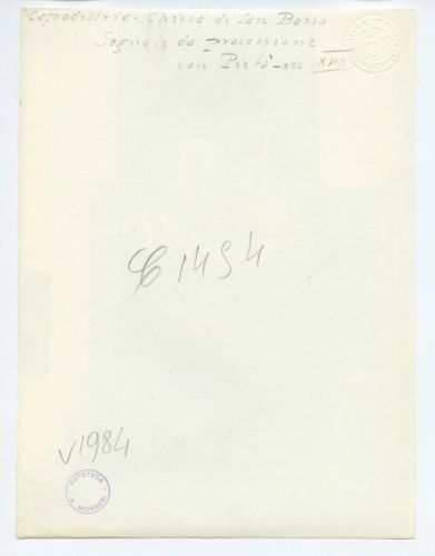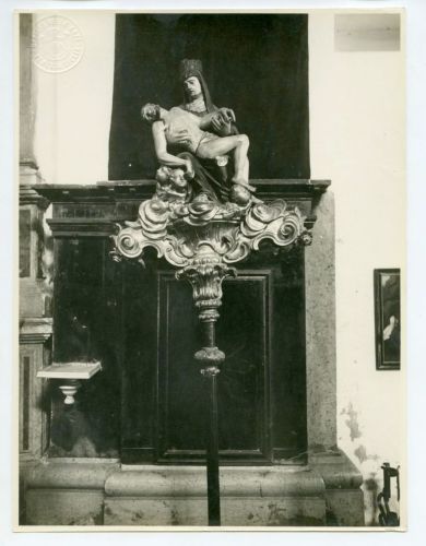 Riproduzione fotografica di un segnale da processione del sec. XVIII conservato, nel momento della ripresa, presso la Chiesa di San Basso di Koper (Capodistria), città della Slovenia. La sommità del segnale da processione è decorata con una Pietà.