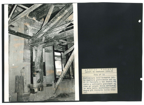 Particolare dell'innesto delle capriate lignee provvisorie sul muro di facciata, per la costruzione del nuovo solaio.