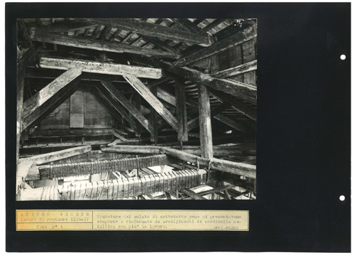 Travature del solaio rinforzate da cordicelle metalliche, riprese prima dell'intervento conservativo.