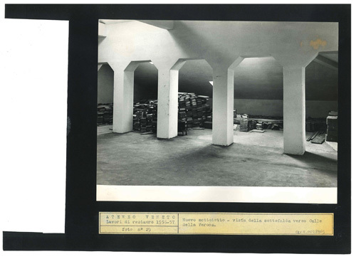 Una campata laterale del solaio (sottofalda verso Calle della Verona) dopo il restauro, occupata da una catasta di libri.