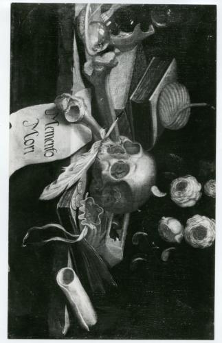 Riproduzione fotografica del dipinto raffigurante una natura morta con teschio, clessidra, libri, borsellino e un foglio con la scritta "Memento mori", opera di scuola tedesca della seconda metà del Seicento