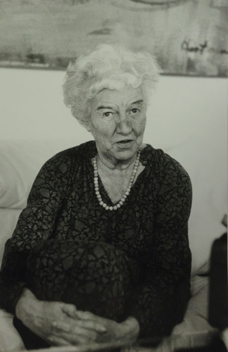 Servizio fotografico: Servizio fotografico: Peggy Guggenheim con vestito scuro a fiori a Palazzo Venier