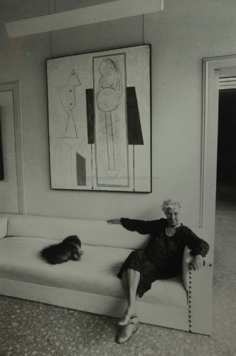 Peggy Guggenheim sul suo divano a Palazzo Venier dei Leoni con uno dei suoi cani Lhasa Apso. Alle sue spalle si può vedere il dipinto di Pablo Picasso, "l'Atelier" (1928); più a sinistra si intravede il bordo del dipinto di Georges Braque, "Le Compotier de raisins" (1926)