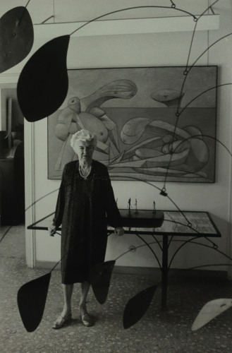 Peggy Guggenheim nella sala d'ingresso di Palazzo Venier dei Leoni. In primo piano "Arco di petali" di Alexander Calder (1941). Sul tavolo alle sue spalle è posata la scultura di Giacometti, "Piazza" (1947-48/fusione 1948-49), alla parete è appeso il dipinto di Pablo Picasso, "La Baignade" (1937). Nella stanza accanto a sinistra si intravede la scultura di Antoine Pevsner, "Superficie sviluppabile" (1941)