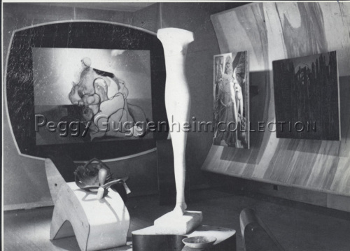 Sala dedicata alle opere surrealiste della galleria Art of This Century di New York di Peggy Guggenheim nel 1942. Sono distinguibili (da sinistra a destra) le opere: "Il bacio" di Max Ernest del 1927, "Donna sgozzata" del 1932 e "Donna che cammina" del 1936 di Alberto Giacometti, "La vestizione della sposa" del 1940. Allestimento di Friederick Kiesler.