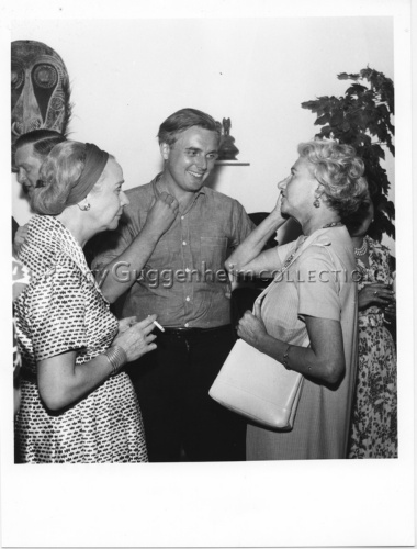 Peggy Guggenheim è in compagnia di Timothy Hennessy e di Nelly van Doesburg. I tre conversano all'inaugurazione della mostra "Arte primitiva nera" organizzata da Paolo Barozzi nel giugno-luglio del 1960 presso l'ufficio del padre in Frezzeria a Venezia, dove furono esposte opere dei popoli Dogon, Baulè, Bambara e maschere dalla Melanesia. Lungo le pareti della stanza si possono vedere alcune delle opere esposte, tra cui una grande maschera tibale.