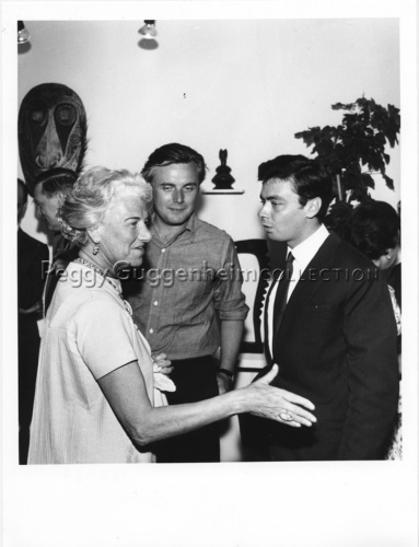 Peggy Guggenheim sorridente in compagnia scultore californiano Timothy Hennessy, il giovane con la camicia, e allo scrittore Paolo Barozzi, l'uomo con la cravatta nera e la giacca.