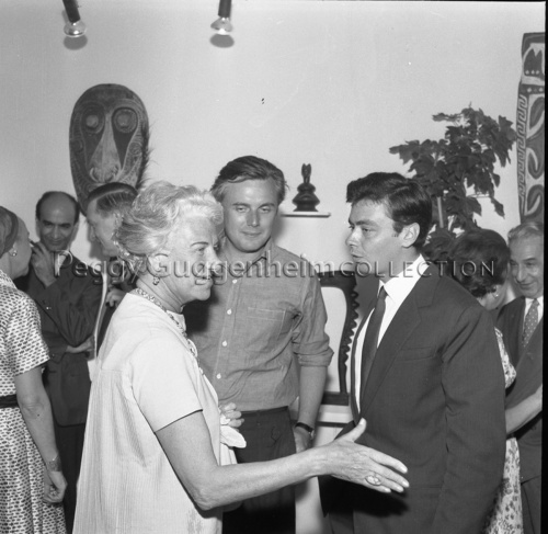 Peggy Guggenheim sorridente in compagnia scultore californiano Timothy Hennessy, il giovane con la camicia, e allo scrittore Paolo Barozzi, l'uomo con la cravatta nera e la giacca.