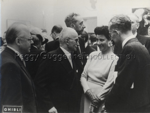 Peggy Guggenheim con Elio Zorzi, il Presidente Luigi Einaudi e Rodolfo Pallucchini (da sinistra a destra) al padiglione greco della XXIV Biennale dArte di Venezia, durante l'inaugurazione dell'esposizione della sua collezione.