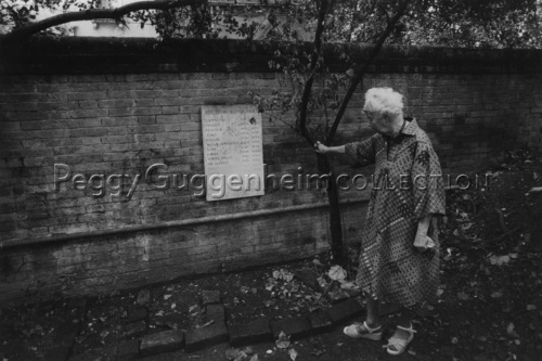 Peggy Guggenheim nel giardino di Palazzo Venier dei Leoni, accanto alla lapide che ricorda il luogo di sepoltura dei suoi numerosi cani. Nello stesso luogo verranno poi deposte le sue ceneri.