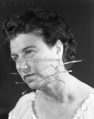 Peggy Guggenheim di profilo con indosso gli orecchini in metallo realizzati per lei dal noto artista Alexander Calder.