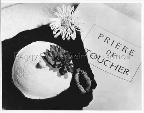 Composizione formata dall'opera di Marcel Duchamp "Prière de toucher" (1947, destinazione ignota) e degli orecchini personali di Peggy Guggenheim. Da sinistra vediamo un orecchino moderno floreale veneziano composto da un intreccio di perline, un orecchino moderno floreale parigino, infine un orecchino moderno vegetale di stile americano confezionato da Pegeen Vail, filgia di Peggy.