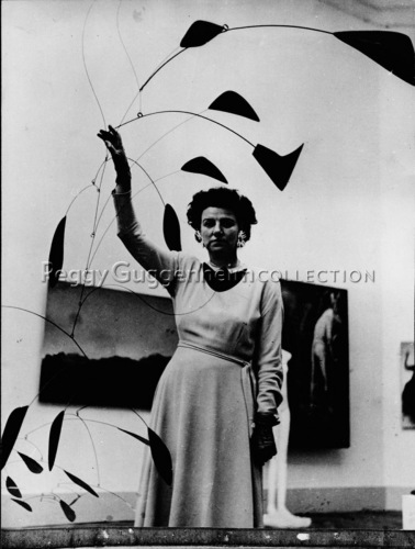 Peggy Guggenheim al padiglione greco della XXIV Biennale d’Arte di Venezia vicino alla scultura di Alexander Calder, "Arco di Petali" del 1941. Sullo sfondo due quadri di Max Ernst: "La città intera" del 1936-37 e "L'antipapa" del 1941-42 (da sinistra a destra).