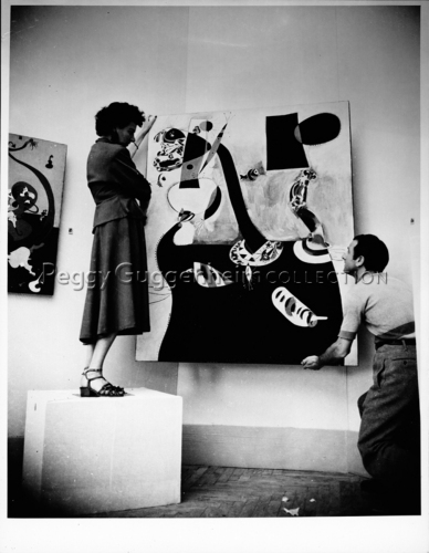 Peggy Guggenheim mentre sorregge la tela di Joan Mirò "Donna seduta II" del 1925 durante l'allestimento della mostra della sua collezione al padiglione greco della XXIV Biennale d’Arte di Venezia. Alle sue spalle il dipinto di Joan Miró, “Interno olandese II” del 1928.
