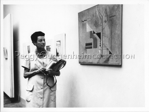 Peggy Guggenheim, con lo sguardo rivolto verso destra, al Padiglione Italia della 29. Biennale Arte di Venezia (1958)davanti all'opera di Osvaldo Licini "Castelli in aria" (1932, Milano, Collezione Privata). Dietro a Peggy si notano dei visitatori intenti ad osservare le opere esposte