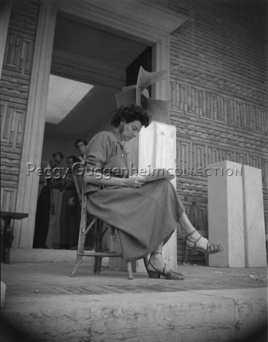L'immagine ritrae Peggy Guggenheim mentre legge un giornale seduta davanti al Padiglione Greco alla 24. Biennale Arte di Venezia nel 1948. Alle sue spalle è visiblie l'opera di Antoine Pevsner "Superficie sviluppabile" (1941, Peggy Guggenheim Collection)