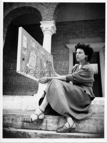 Peggy Guggenheim con l'opera di Pegeen Vail "Interno" (1945, destinazione ignota), seduta sugli scalini del Padiglione Greco della 24. Biennale Arte di Venezia del 1948