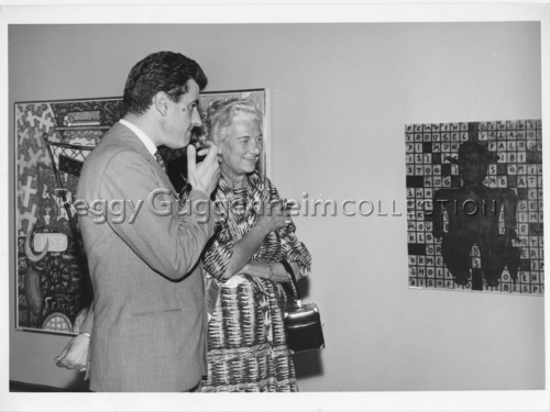 Peggy Guggenheim sorridente davanti una delle opere di William Copley esposte alla mostra personale presso la Galleria del Cavallino nel 1960. Con lei il gallerista Renato Cardazzo