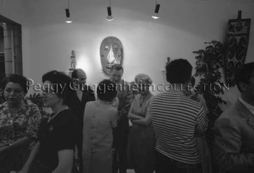 Peggy Guggenheim all'inaugurazione della mostra "Arte primitiva nera" organizzata da Paolo Barozzi nel giugno-luglio del 1960 presso l'ufficio del padre di questo in Frezzeria a Venezia, dove furono esposte opere dei popoli Dogon, Baulè, Bambara e maschere dalla Melanesia. Lungo le pareti della stanza si possono vedere alcune delle opere esposte, tra cui una grande maschera tibale. Peggy Guggenheim si strova assieme ad un gruppo di persone tra le quali John Meyers, l'uomo alla sua destra. Sulla parete di fondo della stanza si possono notare alcune delle opere esposte, fra le quali una grande maschera tribale. In primo piano a destra si vede la figura di un giovane di spalle che conversa con Nelly van Doesburg. La donna alla sinistra della foto con la collana è Maria Franchin.