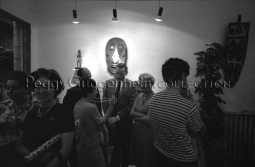 Peggy Guggenheim all'inaugurazione della mostra "Arte primitiva nera" organizzata da Paolo Barozzi nel giugno-luglio del 1960 presso l'ufficio del padre di questo in Frezzeria a Venezia, dove furono esposte opere dei popoli Dogon, Baulè, Bambara e maschere dalla Melanesia. Lungo le pareti della stanza si possono vedere alcune delle opere esposte, tra cui una grande maschera tibale. Peggy Guggenheim all'inizio degli anni '60 durante una mostra di arte primitiva africana insieme ad un gruppo di persone tra le quali John Meyers, l'uomo alla destra di Peggy. Sulla parete di fondo della stanza si possono notare alcune delle opere esposte, fra le quali una grande maschera tribale. In primo piano a destra si vede la figura di un giovane di spalle che conversa con Nelly van Doesburg. La donna alla sinistra della foto con la collana è Maria Franchin.