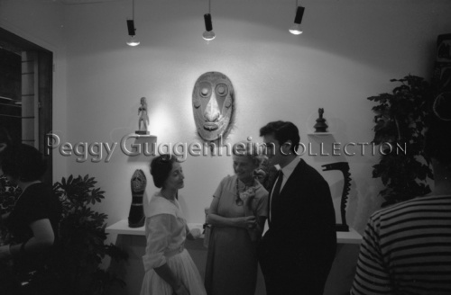 L'immagine ritrae Peggy Guggenheim insieme all'amico Paolo Barozzi e alla pittrice Matelda Capisani. I tre conversano all'inaugurazione della mostra "Arte primitiva nera" organizzata da Paolo Barozzi nel giugno-luglio del 1960 presso l'ufficio del padre di questo in Frezzeria a Venezia, dove furono esposte opere dei popoli Dogon, Baulè, Bambara e maschere dalla Melanesia. Lungo le pareti della stanza si possono vedere alcune delle opere esposte, tra cui una grande maschera tibale.