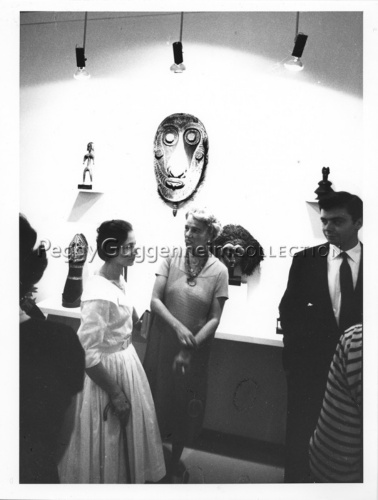 L'immagine ritrae Peggy Guggenheim insieme all'amico Paolo Barozzi e alla pittrice Matelda Capisani. I tre conversano all'inaugurazione della mostra "Arte primitiva nera" organizzata da Paolo Barozzi nel giugno-luglio del 1960 presso l'ufficio del padre di questo in Frezzeria a Venezia, dove furono esposte opere dei popoli Dogon, Baulè, Bambara e maschere dalla Melanesia. Lungo le pareti della stanza si possono vedere alcune delle opere esposte, tra cui una grande maschera tibale.