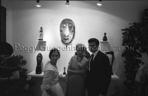 L'immagine ritrae Peggy Guggenheim insieme all'amico Paolo Barozzi e alla pittrice Matelda Capisani. I tre conversano all'inaugurazione della mostra "Arte primitiva nera" organizzata da Paolo Barozzi nel giugno-luglio del 1960 presso l'ufficio del padre di questo in Frezzeria a Venezia, dove furono esposte opere dei popoli Dogon, Baulè, Bambara e maschere dalla Melanesia. Lungo le pareti della stanza si possono vedere alcune delle opere esposte, tra cui una grande maschera tibale.
