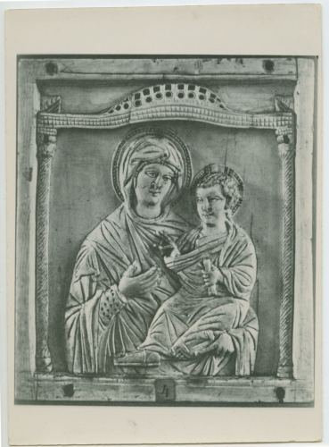 Riproduzione fotografica di un bassorilievo ligneo che rappresenta la madonna con bambino conservato nel Museo civico di Bamberga.