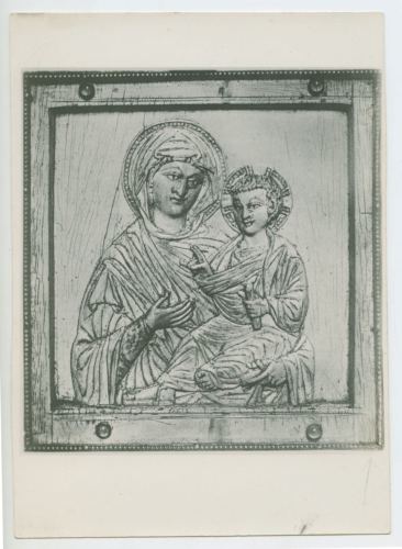 Riproduzione fotografica di un bassorilievo ligneo che rappresenta la madonna con bambino conservato nella Cattedrale di Aquisgrana