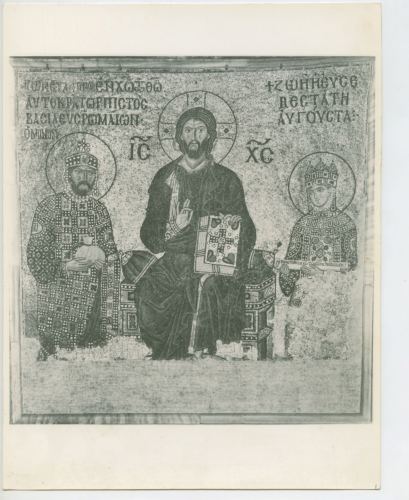 Riproduzione fotografica del mosaico che rappresenta il gruppo composto da Cristo Pantocratore affiancato da Costantino IX e dalla moglie Zoe, collocato nel matroneo sud della basilica di Santa Sofia a Istanbul.